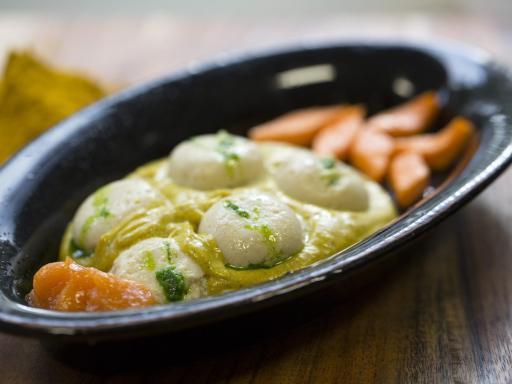 Boller i karry med ris, peberfrugt og mangochutney (cremet)