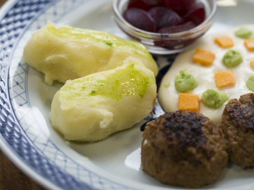 Frikadeller med stuvede ærter og gulerødder, kartofler, persille og syltet rødbede (gratin)