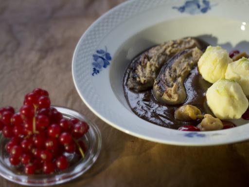 Kalvehjerter i flødesauce, kartoffelmos, tyttebær og persille (gratin)