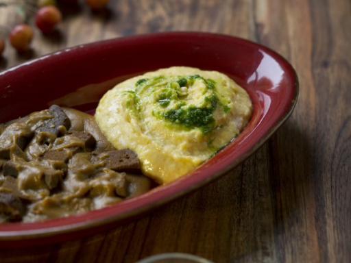 Bøf stroganoff med rodfrugtmos, asier og basilikum (cremet)